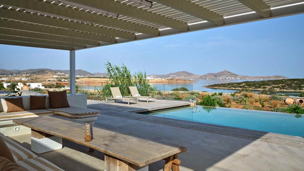 Apart from the ample interior spaces, this exclusive villa in Paros also offers extended outdoor living spaces. A large infinity pool with sun loungers on a wooden pool deck at the rim of the property, a pergola-shaded sizeable lounging area, a separate dining area with barbeque and an outdoor bar will dress your days and nights in the most stunning views of the rugged coastline around the property.