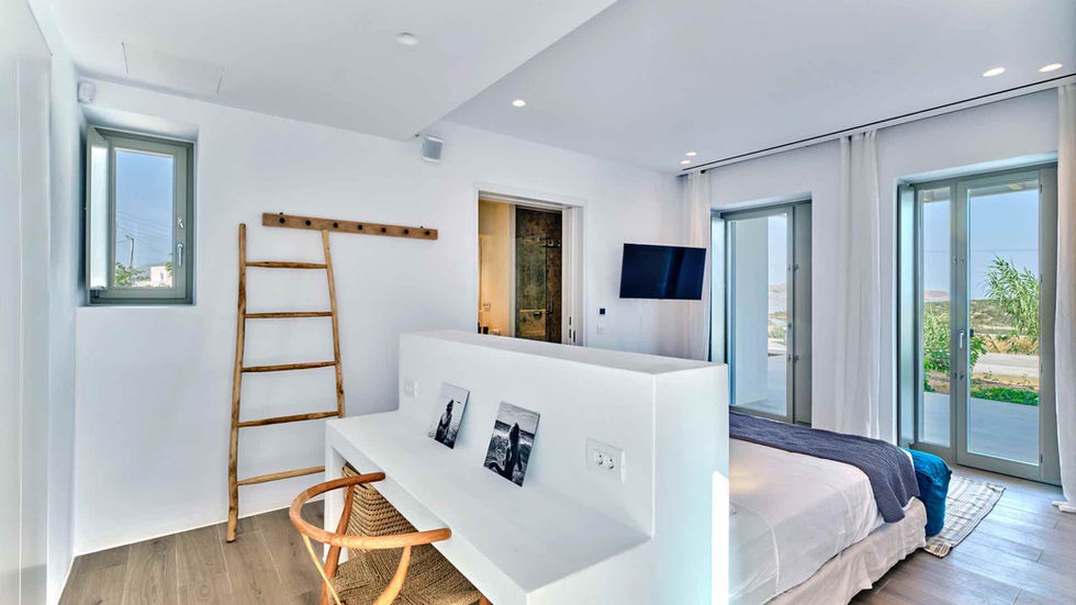 An enthralling brand-new property, not only in our portfolio but also on the island of Paros, Villa Cezanne will enchant you as soon as you lay your eyes on it. Boasting a fantastic, super-convenient location right between Naousa, the vibrant centre of the island for dining and nightlife, and the famous Santa Maria resort with its two stunning beaches, the villa is a bright, abundant home for 12 guests unfolding in a two-storey house and an entirely separate guesthouse for two, at the edge of its vast courtyard. The ground floor of the main house features 3 double en-suite bedrooms, elegantly decorated, while the top floor hosts 2 double en-suite bedrooms open to voluminous balconies breathing in the awe-inspiring views of the sea and the surrounding area.